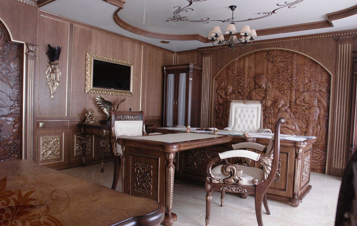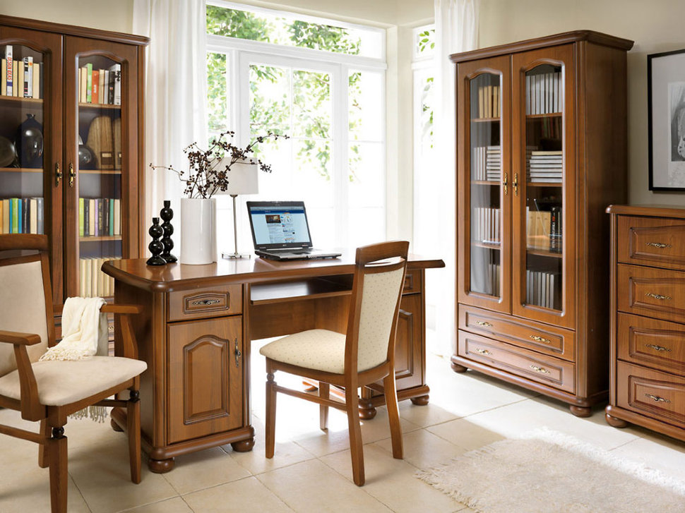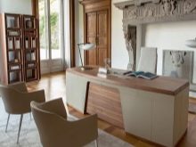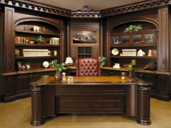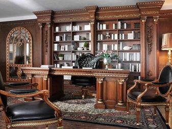 Si vous souhaitez aménager le bureau avec luxe et élégance, votre maison ou votre appartement sont conçus dans le style classique. assurez-vous de faire attention au baroque préféré de tout le monde. Ce style est caractérisé par l'utilisation de meubles en bois naturel et en bois massif avec de beaux détails sculptés.Des détails plaqués or sur le mobilier sont également présents, les chaises sont principalement choisies en cuir véritable.