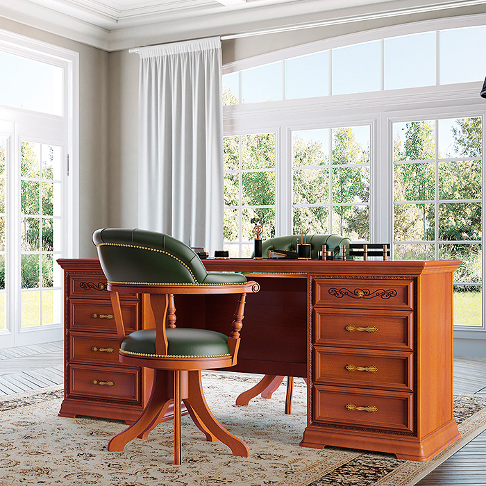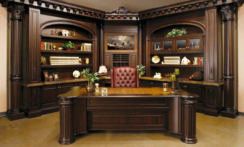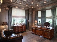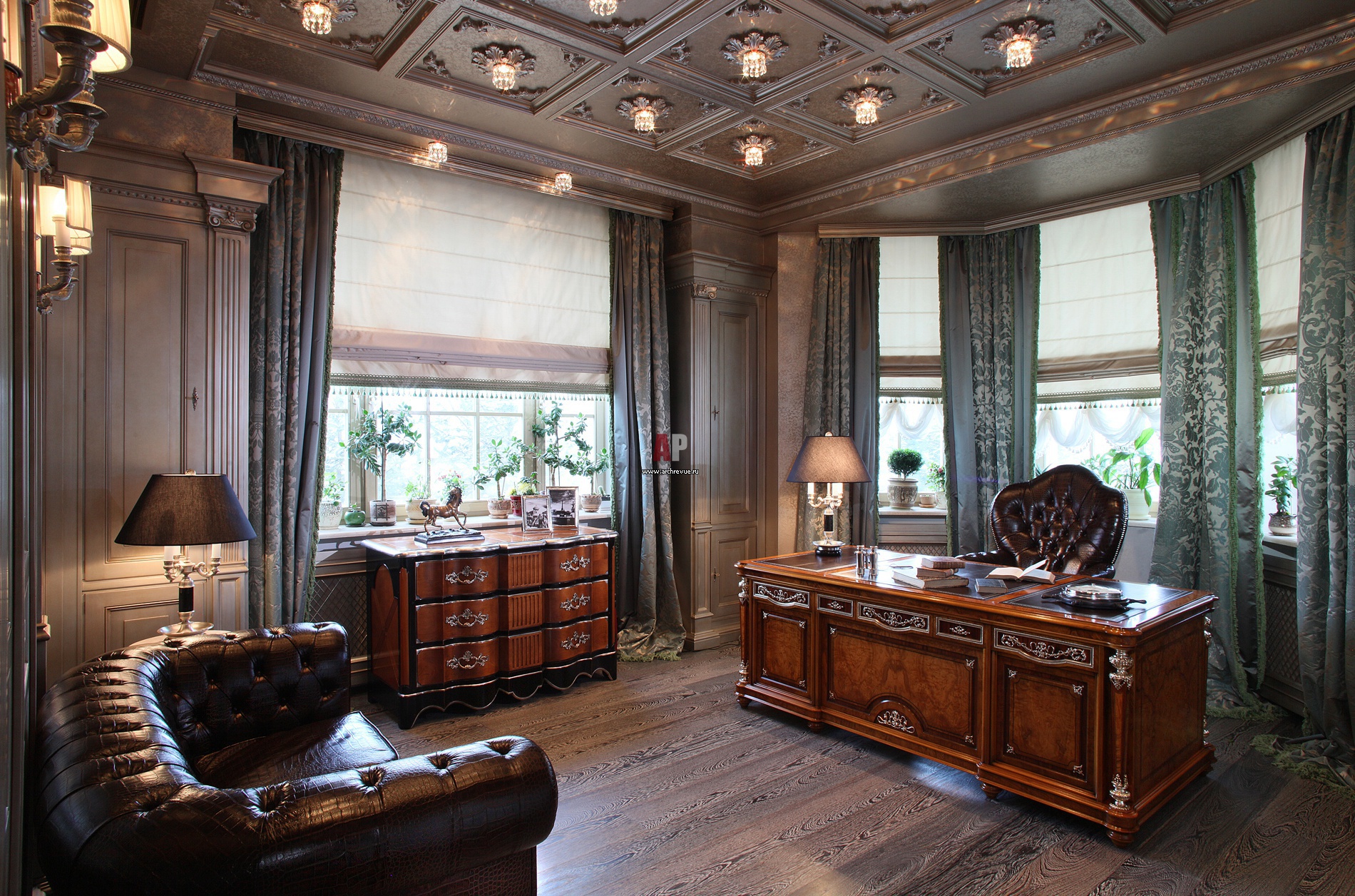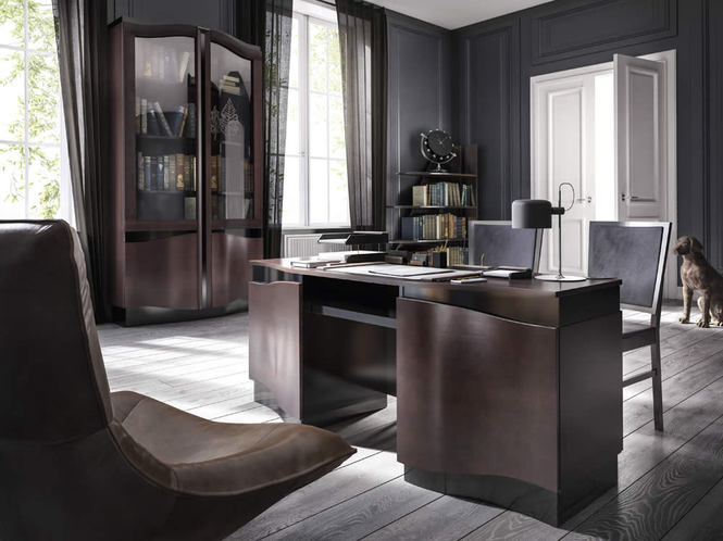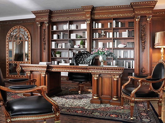 L'un des styles les plus pertinents, qui appartient aux classiques, est considéré comme le style Empire.. Ses principales caractéristiques sont avant tout la commodité et la fonctionnalité du lieu de travail. Les meubles en bois naturel associés à du cuir et à des textiles coûteux, dans différentes nuances, s'harmonisent parfaitement avec l'intérieur de ce style.