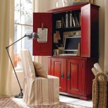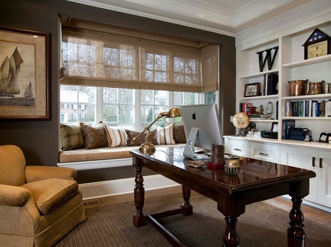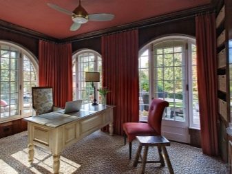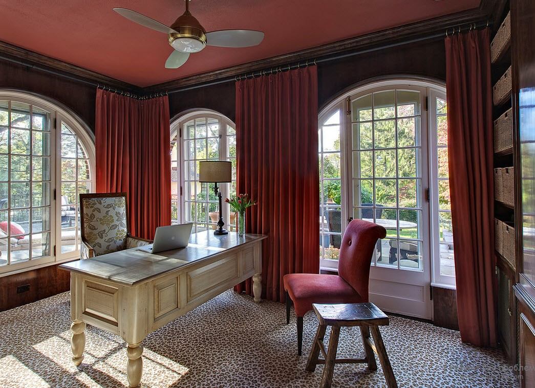 Les bureaux à domicile de style classique peuvent être émis dans des tons bordeaux et clairs. Cette combinaison de couleurs a toujours l’air très rentable. La table lumineuse, d'époque stylisée et complétée par de belles sculptures, peut être complétée par une chaise de travail confortable avec un imprimé floral, ainsi qu'une chaise d'invité de couleur bordeaux.