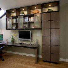 La place principale dans la cabine, bien sûr, est la zone de travail, et plus spécifiquement, le bureau. Mais à part cela, il est également impossible d'oublier les autres attributs du mobilier. Ensuite, nous examinons les principaux composants de mobilier du bureau à domicile.