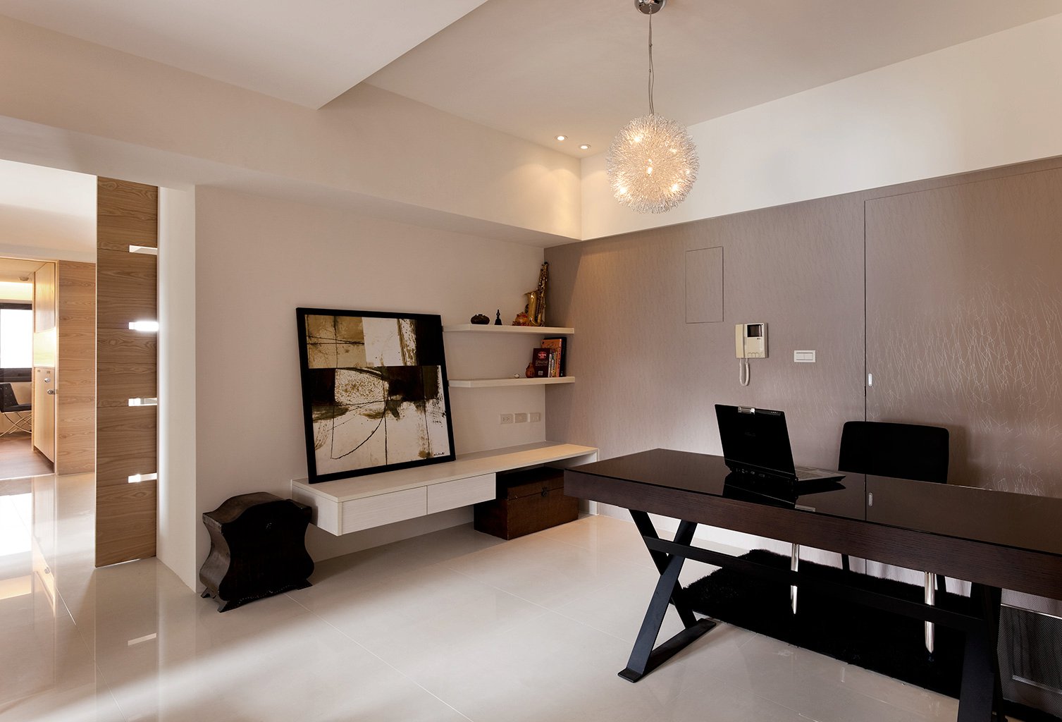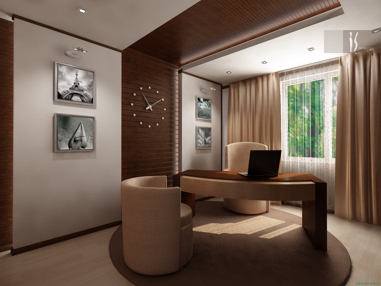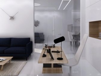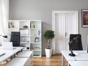 La place du futur cabinet pourrait être de taille différente. Mais plus la pièce est petite, plus les matériaux de finition et les meubles sont brillants. Les nuances délicates laiteuses et nues des meubles augmentent toujours légèrement l'espace. Assurez-vous de faire attention à eux.
