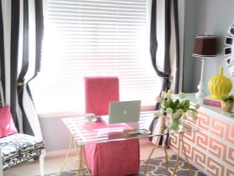 Le bureau harmonieux d’une jeune fille ou d’un étudiant qui aime les nuances de rose nude peut avoir l’air très mignon et beau. La table en verre, complétée par une confortable chaise rose tendre, attirera certainement l'attention non seulement de la jeune hôtesse, mais aussi des invités de la pièce.