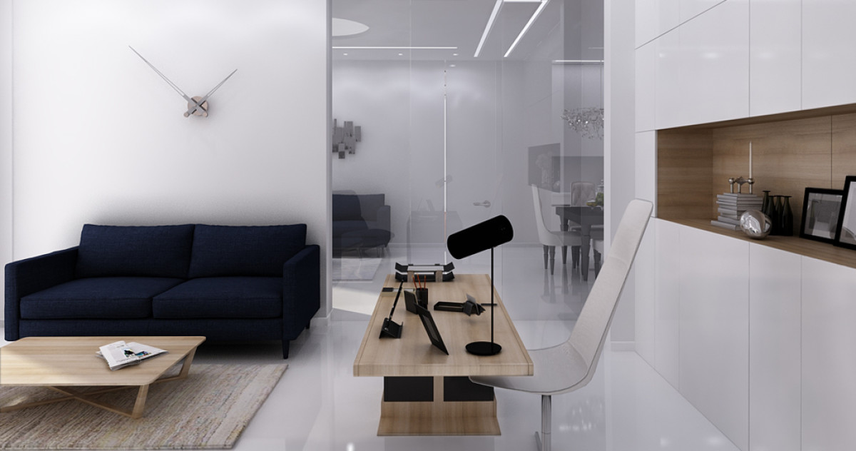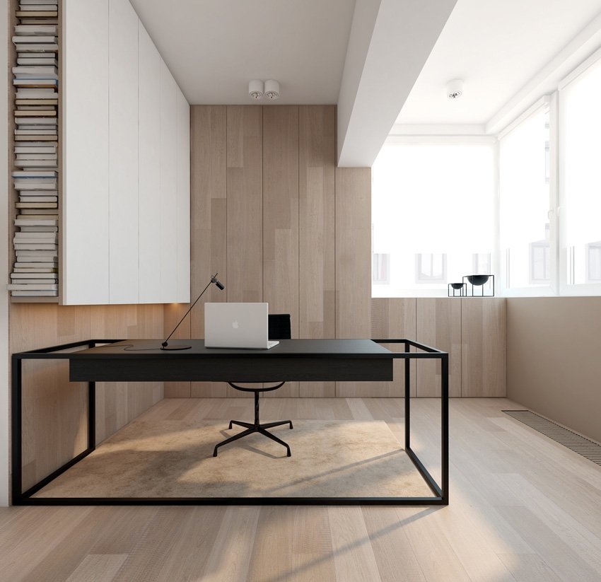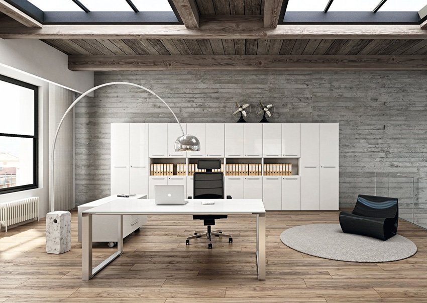 Très populaire moderne Le style dans lequel les intérieurs des bureaux sont conçus est le minimalisme.. Dans ce bureau, vous n'aurez rien d'extra, tout est fait pour le travail et le confort. Tous les articles et papiers inutiles sont cachés de manière intelligente et fonctionnelle avec un mobilier ergonomique. Ce style convient particulièrement aux personnes qui souhaitent équiper leur lieu de travail dans une atmosphère de retenue et de confort.