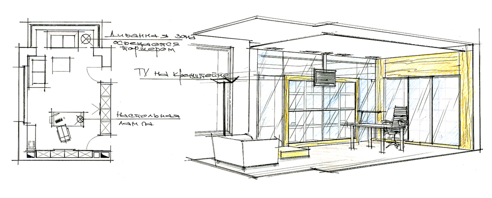 Dans la pièce où vous avez l'intention de travailler, il est très important d'utiliser tout l'espace de manière optimale. Une bonne solution serait de préparer un croquis préliminaire de la disposition du mobilier et de la décoration.. Ainsi, vous verrez immédiatement l’ensemble de la photo avant de lui donner vie.