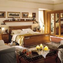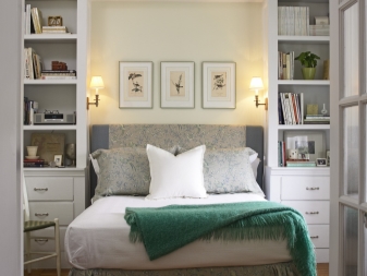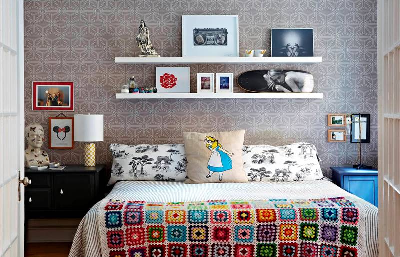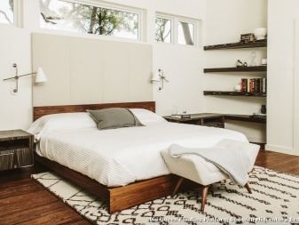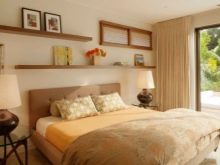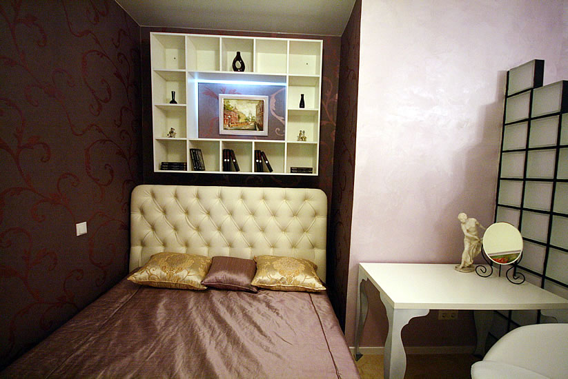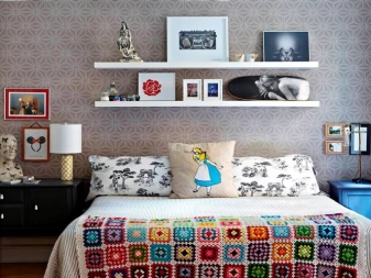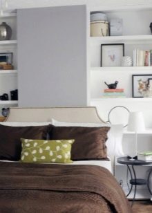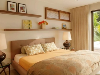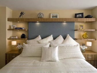 Au-dessus du lit, vous pouvez fixer une large étagère. La chose principale - attachez-le aussi étroitement que possible afin qu'il ne tombe pas au mauvais moment. Sur une telle étagère, il sera possible de placer toutes les petites choses nécessaires que vous utiliserez avant et après le sommeil. Ceci, par exemple, un réveil, toutes sortes de crèmes, peignes, téléphones portables, etc. Cette étagère remplacera votre encombrante armoire de chevet.