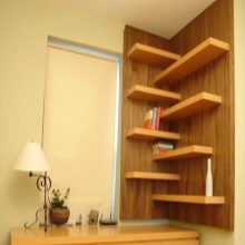 Ces produits diffèrent de la matière dans laquelle ils sont fabriqués. Le bois est le matériau le plus abordable et le plus populaire. Les étagères en bois peuvent être faites en toute sécurité avec vos propres mains. De plus, vous pouvez les décorer à votre guise.
