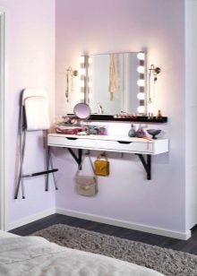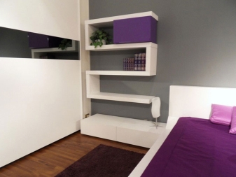 Une autre option pour l'utilisation d'étagères dans la chambre - la conception de la zone de boudoir. Tout peut être fait très simplement. Il suffit de suspendre un grand miroir au mur et de placer des étagères autour. L'option idéale - étagères en verre. Ils seront bien combinés avec une surface lisse. Cette option de conception s'intégrera parfaitement dans la pièce dans un style moderne. Sur ces étagères peuvent accueillir tous les accessoires cosmétiques. De beaux pots avec des crèmes, des flacons de parfum et des produits cosmétiques décoratifs - tout cela sera une magnifique décoration de votre pièce.