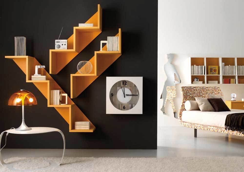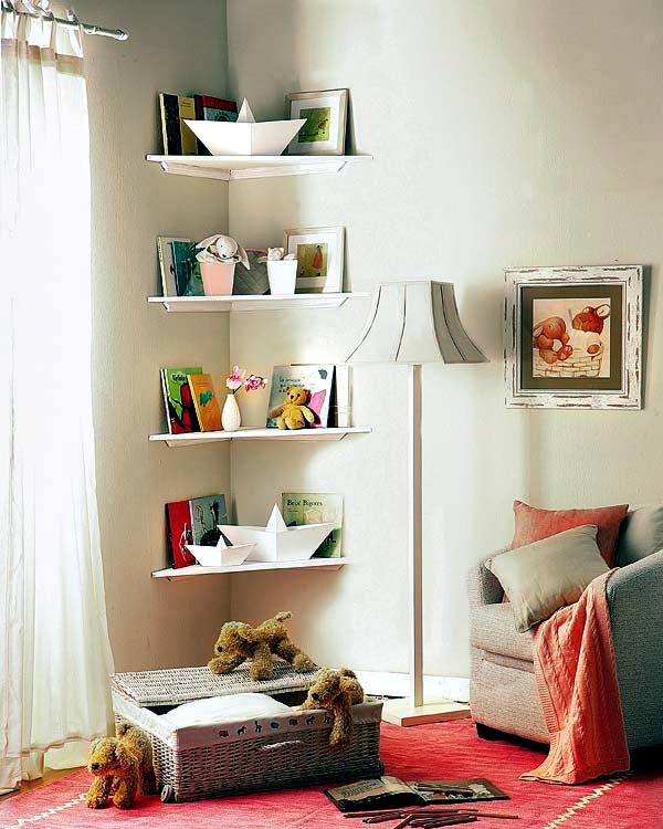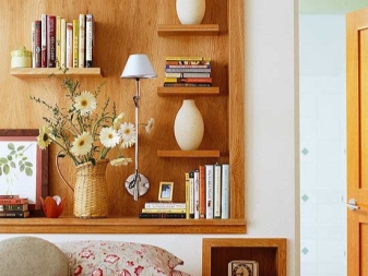 Expérimentez avec les couleurs et les matériaux, utilisez différents éléments de décoration et vous pourrez décorer n'importe quelle chambre avec vos étagères. Lorsque les étagères sont réparées, n'oubliez pas de les émettre. Des livres, des vases avec des fleurs, des produits cosmétiques et toutes sortes de bibelots rendront votre pièce beaucoup plus confortable et attrayante. Dans cette salle, vous serez ravi d’être toujours.