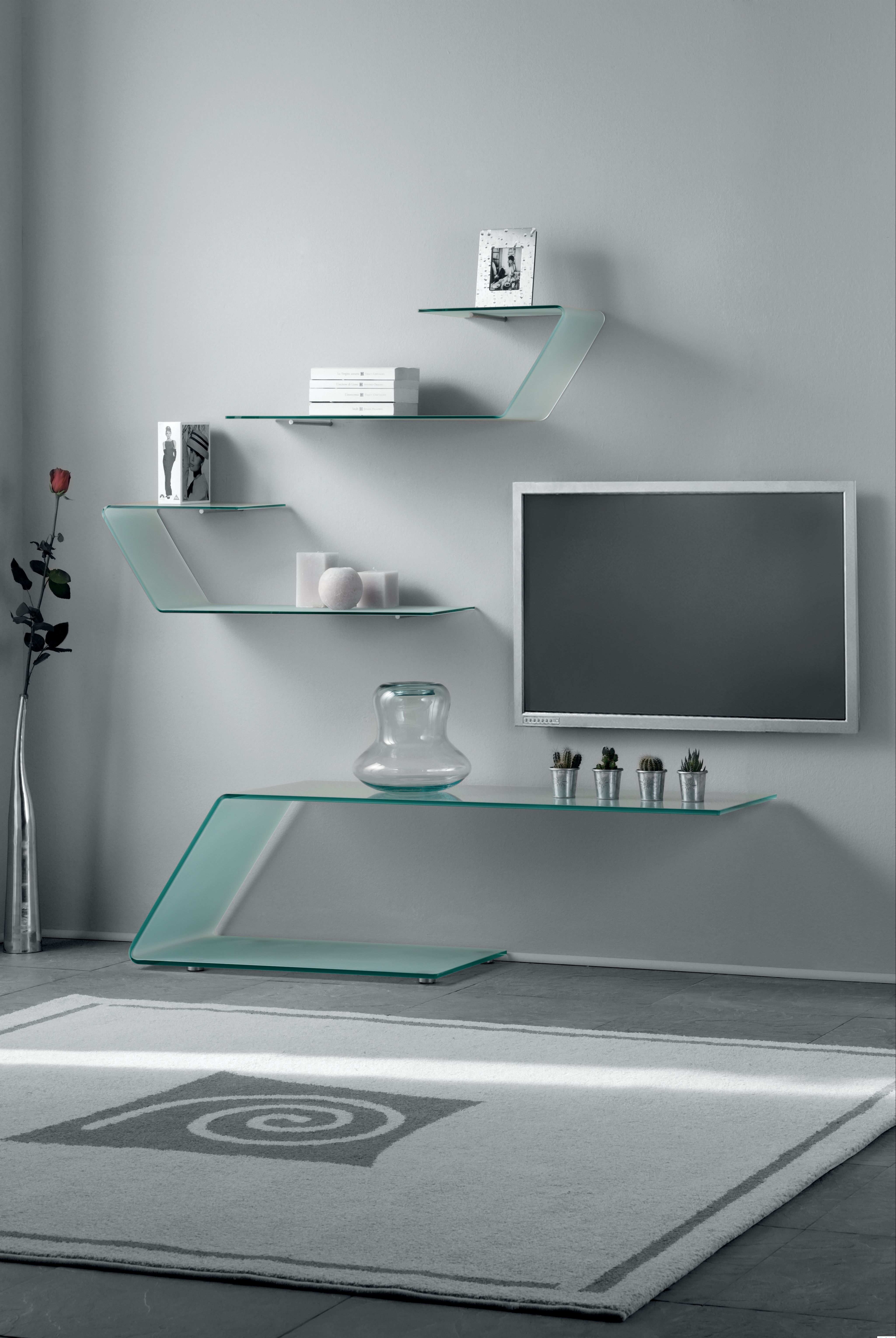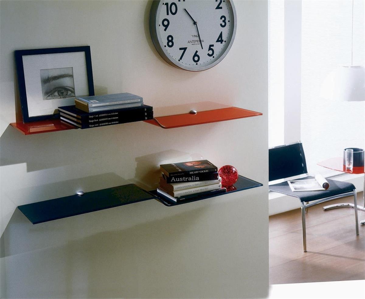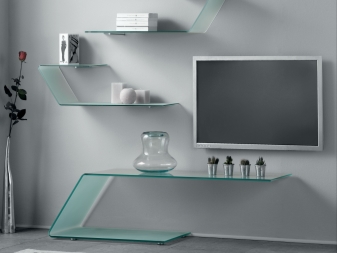 Dans une chambre à coucher moderne, les étagères en verre ou en verre organique ont fière allure. Ils peuvent être transparents ou en verre coloré. Si vous souhaitez rendre votre pièce plus lumineuse, vous pouvez vous concentrer sur les étagères en verre teinté. Ils sont décorés de motifs colorés, ce qui leur permet d’agir eux-mêmes comme des détails décoratifs à l’intérieur.