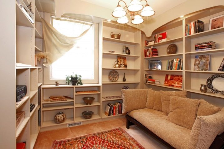 Les étagères murales sont souvent placées autour de la fenêtre. Les étagères installées dans un tel endroit décorent la pièce et créent un coin de lecture idéal. Placez un petit canapé ou un fauteuil près de la fenêtre. Ainsi, vous pouvez lire en permanence des livres à la lumière naturelle. Vous pouvez installer à côté de la chaise une petite étagère sur plusieurs étagères. Il remplacera la version murale. Beaucoup préfèrent de telles étagères, car elles ont l'air très bien.