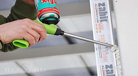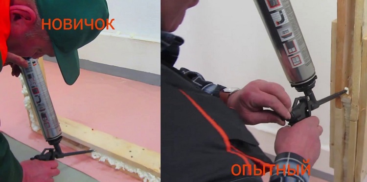 Le mécanisme d’échappement doit être mis en marche aussi doucement que possible en appuyant sur la gâchette. Sinon, vous pouvez libérer une énorme quantité de mousse, qui remplira l'ouverture non seulement de l'intérieur, mais également de l'extérieur. Il faut également tenir compte du fait que la mousse d’assemblage a tendance à augmenter, il n’est donc pas nécessaire de combler le vide complètement. Et la direction du mouvement de la mousse est définie par l'opérateur dans les mains duquel se trouve cet outil de construction.
