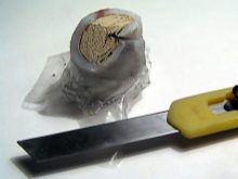 Une fois que la surface est prête pour le dimensionnement, il est nécessaire de couper la quantité nécessaire de colle du cylindre. Le couper devrait être uniquement dans le sens transversal, de sorte que le "rond" résultant contienne à la fois un noyau époxy et un durcisseur, le cadrant. Si un mélange liquide est utilisé, il est extrait du tube de la seringue directement sur la surface de la pièce (comme indiqué dans les instructions) ou pré-mélangé dans des assiettes (selon les recommandations des professionnels).