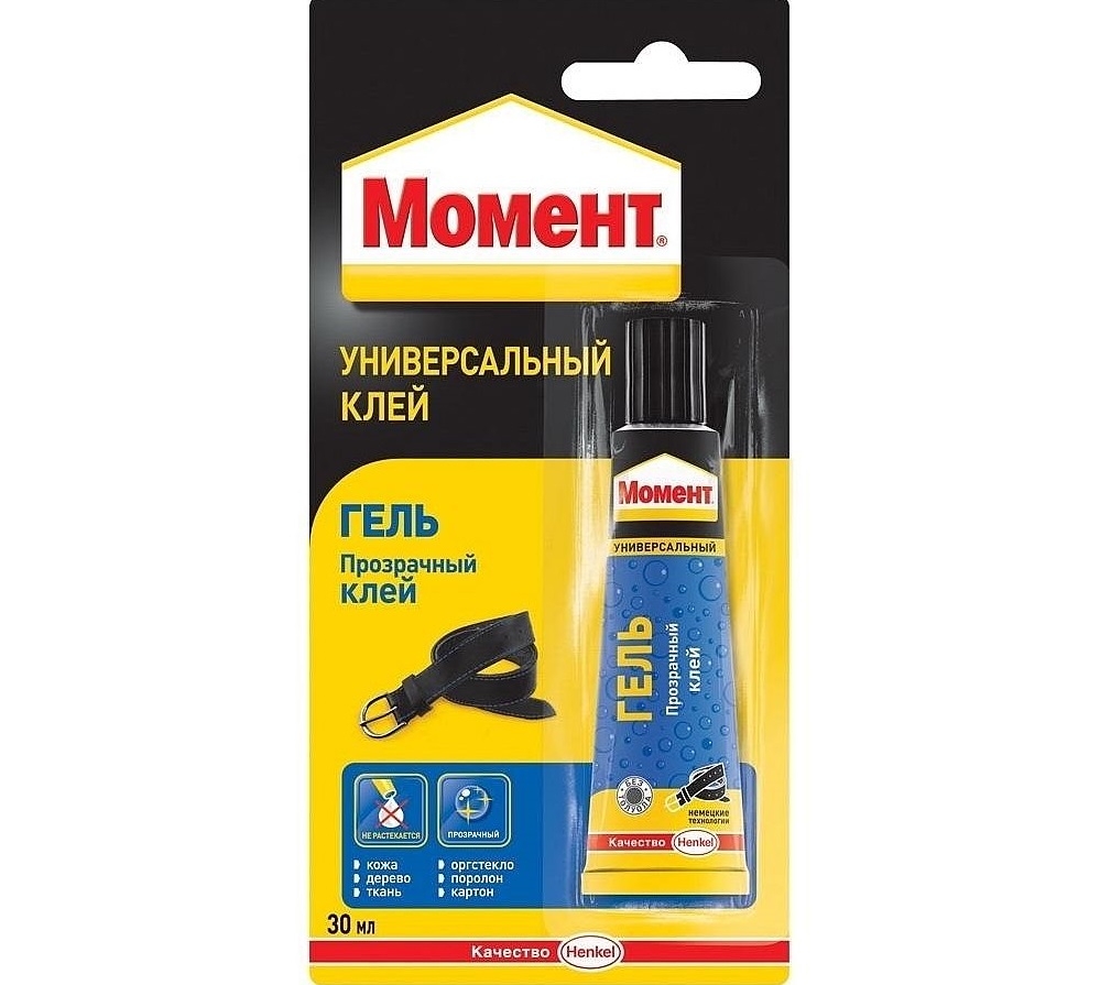 Colle "Moment Gel" - outil facile à utiliser et efficace conçu pour le collage fiable de divers types de surfaces. Le matériau est utilisé à la fois dans la vie quotidienne et dans diverses industries. Il peut «lier» les produits en céramique, en porcelaine, en bois, en métal et en plastique. Idéal pour le carton, le papier épais, le cuir et le caoutchouc.