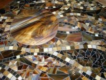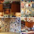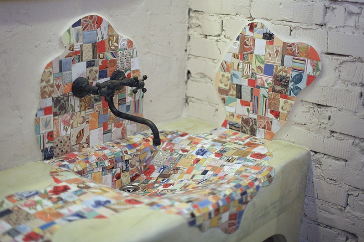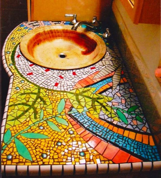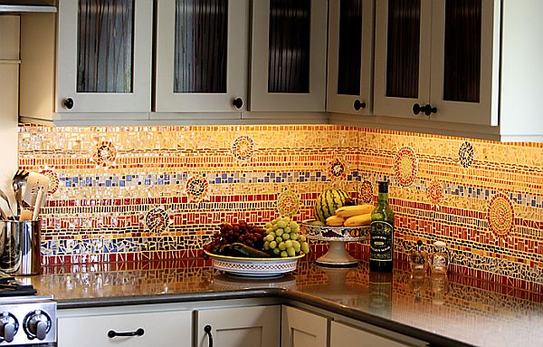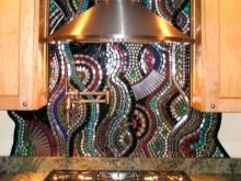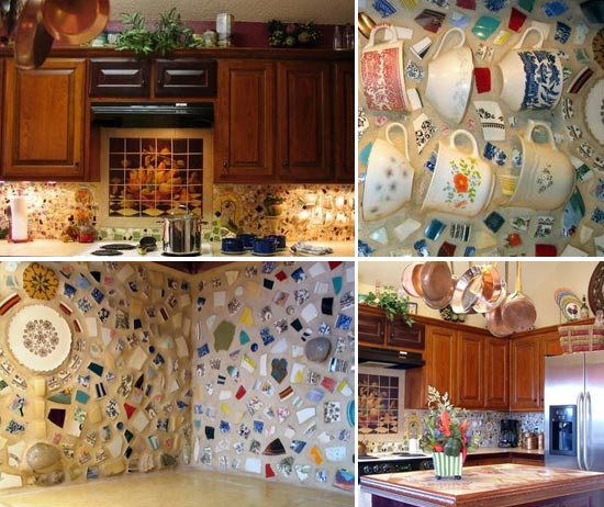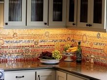 Une option audacieuse serait la conception des trencadis de style cuisine et salon. Dans la cuisine, vous pouvez affecter un espace de travail (tablier et comptoir). Ce type de décor sera le point culminant de toute direction stylistique. Il semble intéressant non seulement une surface plane standard, mais également une surface concave.