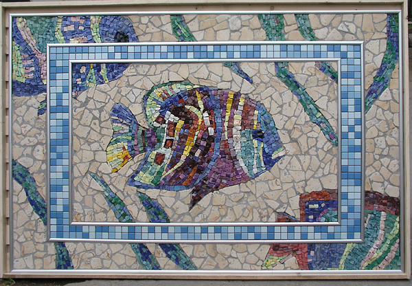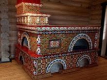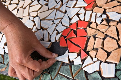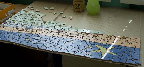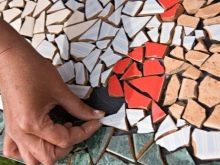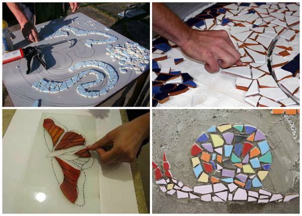 - Mosaïque de couture au four et en tranches. Les détails peuvent être pressés dans la surface de la couche humide ou fixés à la colle, puis frotter les joints avec de l'argile ou de la peinture, en fonction de la taille des trous.