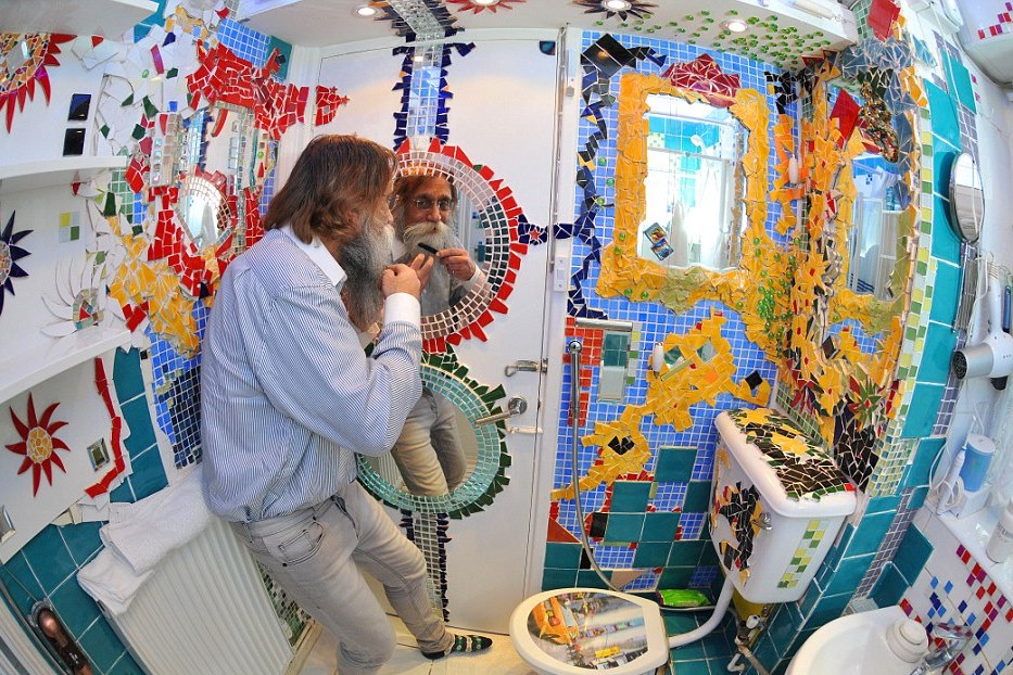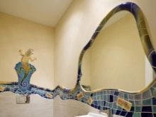 Fondamentalement, les concepteurs appliquent le style de Gaudi dans les salles de bain. La finition est particulièrement soignée sur les côtés et les murs vides. Ainsi, les panneaux émettent des zones fonctionnelles, décorent des accessoires, par exemple des miroirs.