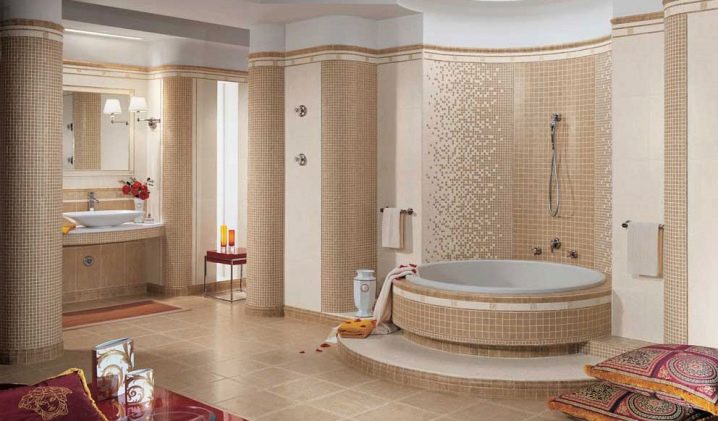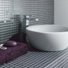 En raison de la petite taille des carreaux de mosaïque, vous pourrez en recouvrir même la surface la plus atypique ou incurvée, par exemple la base d’un bain ovale. De plus, avec l'aide de la mosaïque, vous pourrez créer une transition imperceptible entre les surfaces verticales et horizontales. Un thème séparé et le rêve de chaque designer - panneaux, peintures et ornements ethniques de la mosaïque.