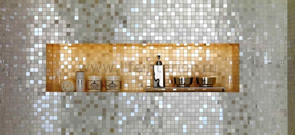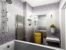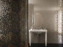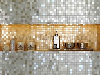 En conclusion, nous ajouterons une dernière chose à tous les avantages de la mosaïque en tant que matériau de finition original: ce revêtement est parfaitement combiné à d'autres textures. Vous pouvez donc ajouter des miroirs, des éviers, des perles ou des cailloux au panneau, ce qui rend l'intérieur exclusif et unique.