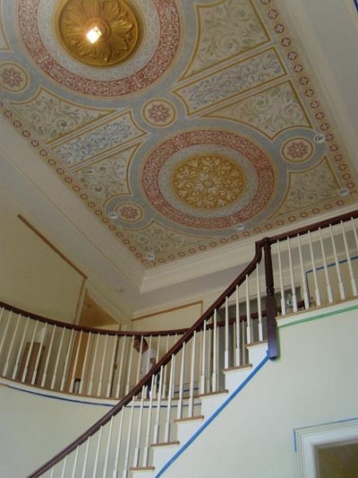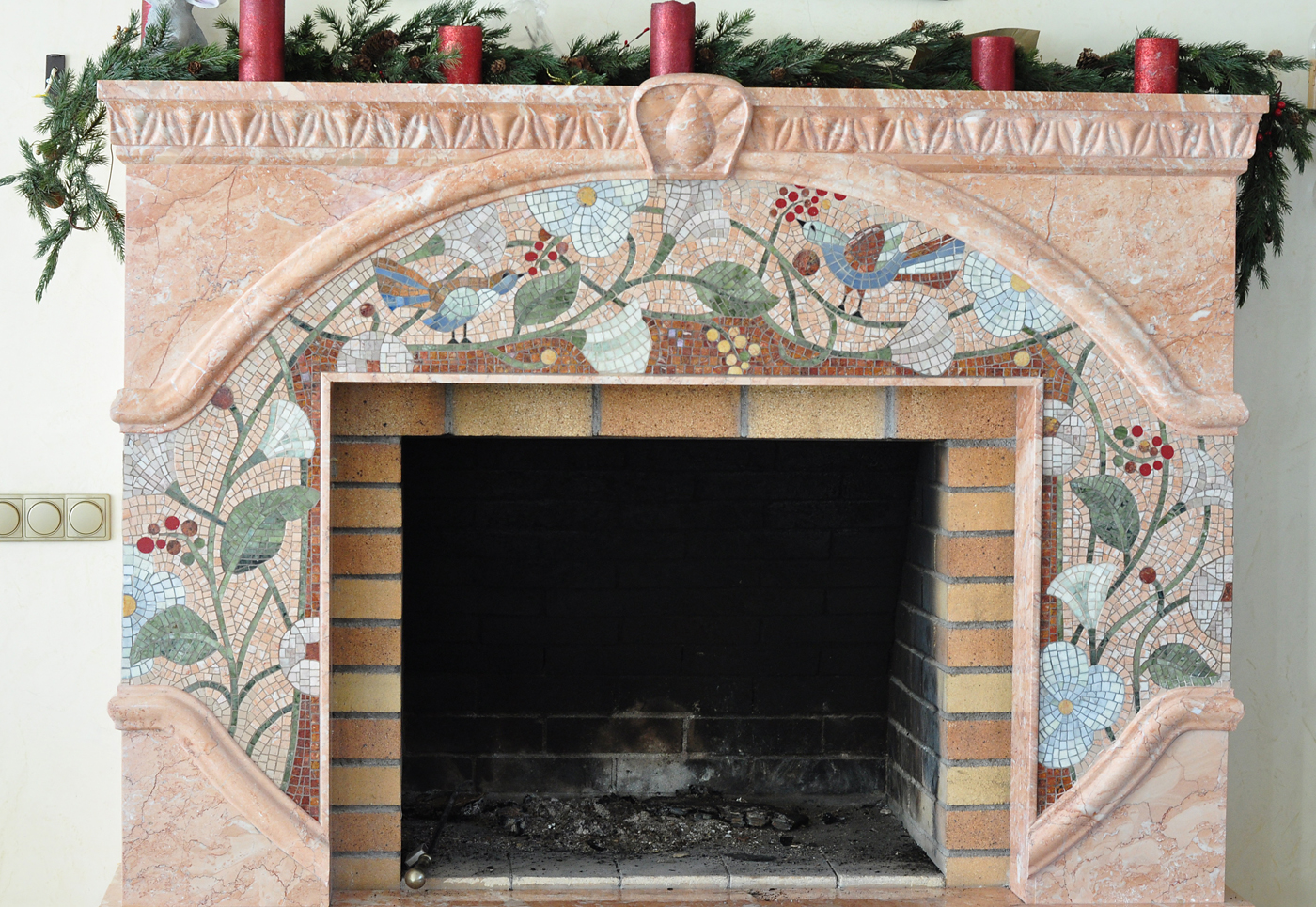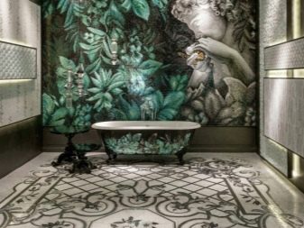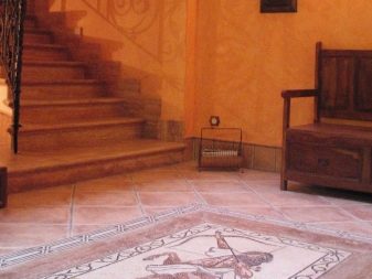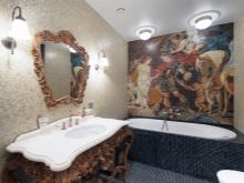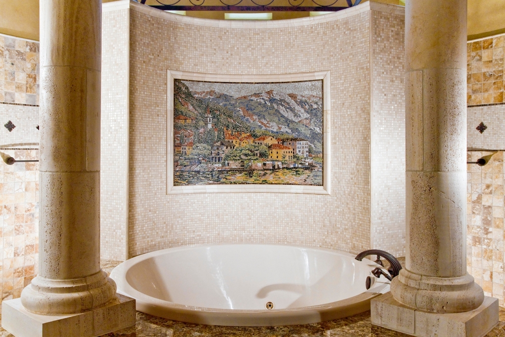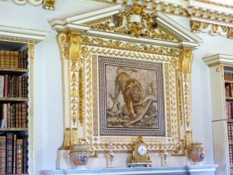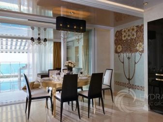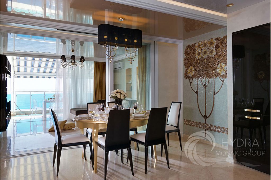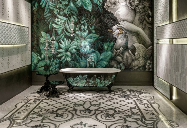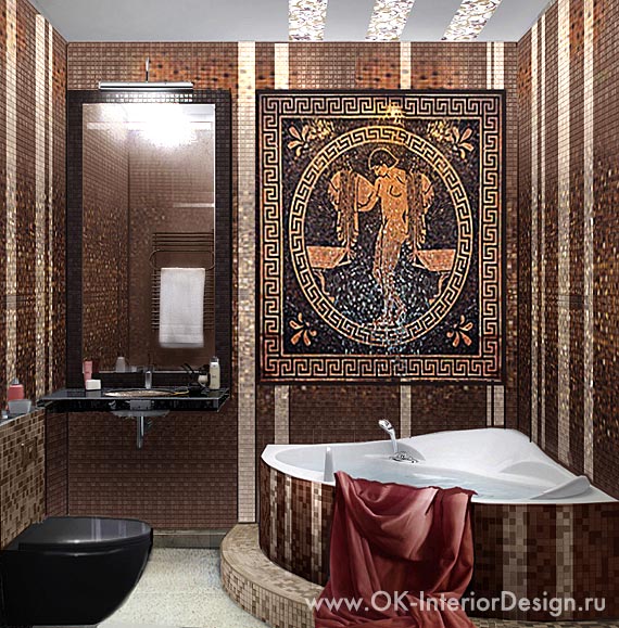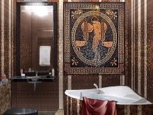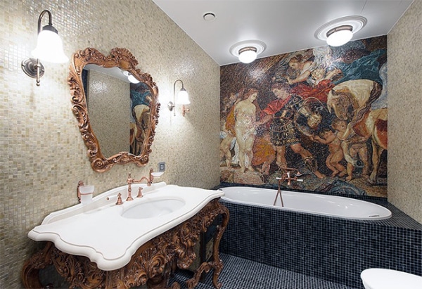 Vous ne devriez pas placer de peintures d'art ou d'autres détails décoratifs sur les murs où il y a déjà une mosaïque romaine. Le panneau de telles tuiles est une décoration autosuffisante et n'a pas besoin d'être ajouté.