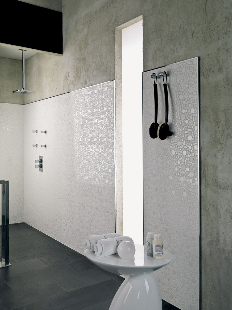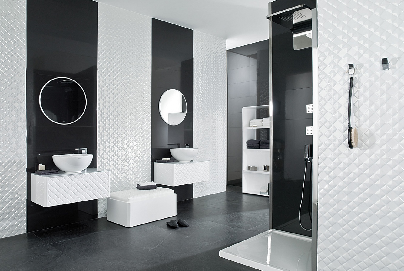Collection de verre - Il s’agit d’un carreau rectifié de grand format de 31,6x90 cm.La tuile a une surface brillante qui ressemble au verre. Grâce à cet effet, la pièce peut être agrandie visuellement et lui donner plus de profondeur et de volume. En 2010, la collection a été complétée par des panneaux décoratifs constitués d'un ensemble de trois carreaux.