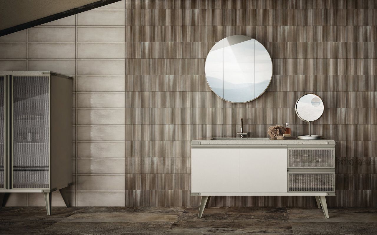 Verre industriel - La thèse principale de la collection, l'architecture de vieux bâtiments abandonnés. Le design de la collection est conçu de telle sorte que chaque élément individuel, encadré par un cadre en métal rouillé, crée des panneaux sous la forme de blocs industriels en verre.