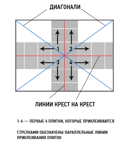 - Maintenant, il est nécessaire de trouver un centre de plancher dans la pièce. Ce n'est pas difficile à faire - tirez les fils en diagonale et marquez leur intersection avec un point. En travers du centre trouvé, tracez 2 lignes parallèles aux murs.