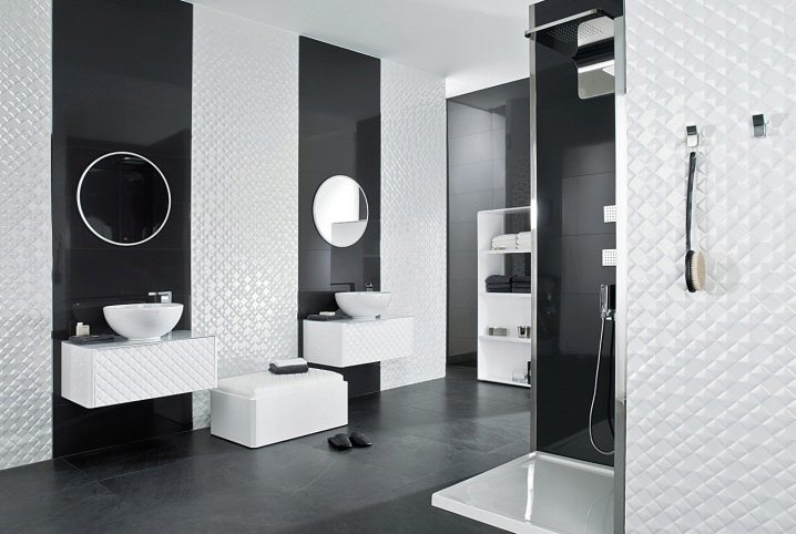Collection Prisma - il s’agit d’une dalle sans soudure du format s31,6x90m avec un motif de losanges en relief et une surface brillante, disponible en noir et blanc.