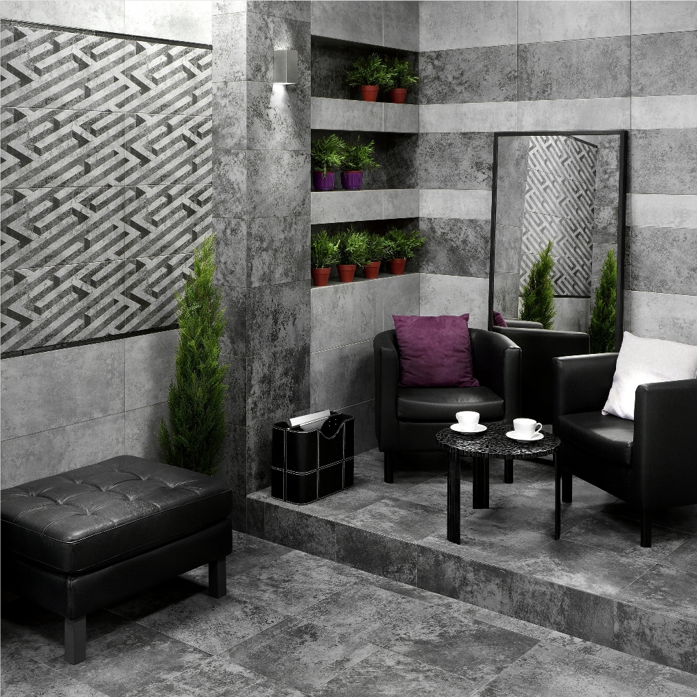 Cette collection vous permet de transmettre la puissance d'une grande ville, car le carrelage imite parfaitement la surface d'une chaussée en béton stricte et froide. La collection comprend deux types de panneaux décoratifs décorés de figures stylisées. Les carreaux de sol sont fabriqués en gris, incarnant la brutalité et la force, il a une surface mate et le format de 40x40 cm.