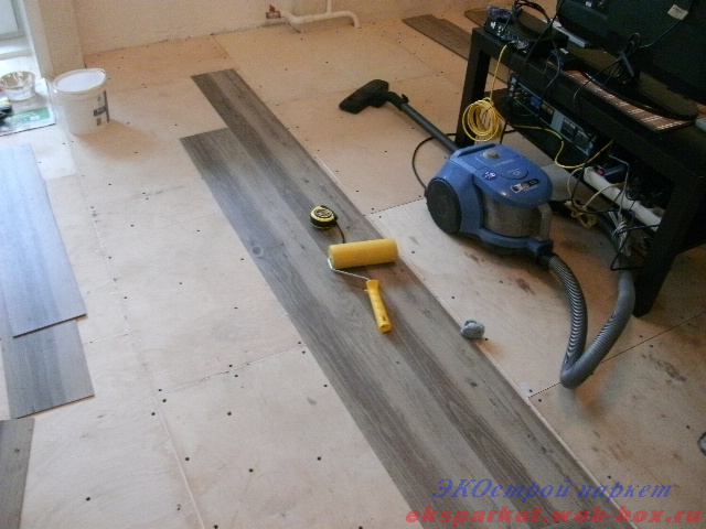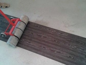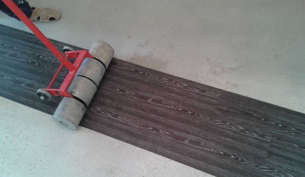 Lorsque la première rangée est prête, un rouleau en caoutchouc passe sur la surface finie. Cela permettra d’évacuer l’air sous les carreaux et de mieux coller le matériau. Enlevez l'excès de colle immédiatement avec un chiffon humide. Lorsque tous les carreaux de vinyle sont posés, il est recommandé de répéter le rouleau sur le revêtement. Cela évitera de décoller les bords des carreaux.
