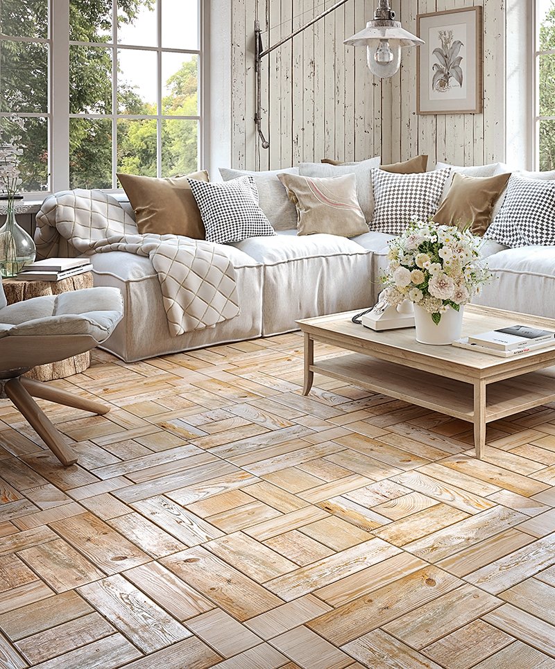 L'aspect du sol doit s'intégrer harmonieusement à l'intérieur de la pièce. Si vous l'installez dans une pièce où il y a peu de sources de lumière naturelle, par exemple une salle de bain, il est préférable de privilégier les modèles lumineux dans des tons chauds.Mais dans les grandes pièces lumineuses, par exemple dans la cuisine ou la salle à manger, vous pouvez empiler des modèles plus sombres et plus lumineux. Une option de conception intéressante consisterait donc à combiner des matériaux sombres et clairs dans la même pièce.