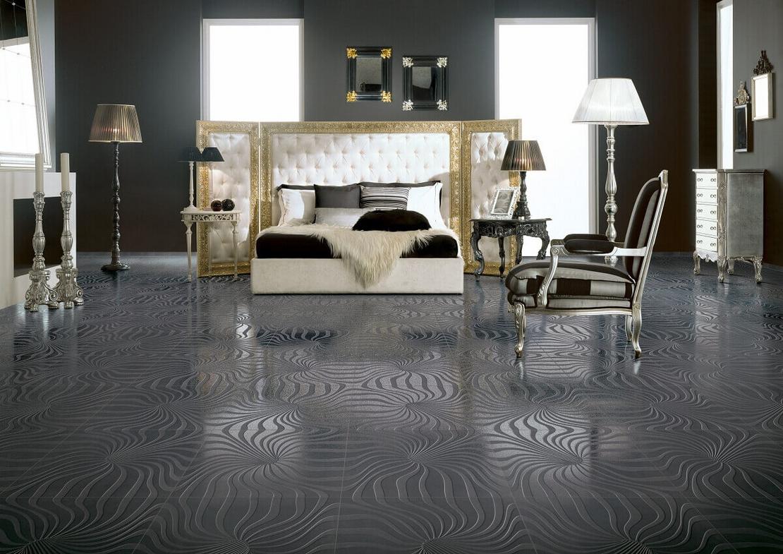 Pour la chambre à coucher est préférable d'acheter des carreaux texturés mats. Pour une telle pièce, les modèles de la deuxième classe de résistance à l'usure sont sélectionnés.