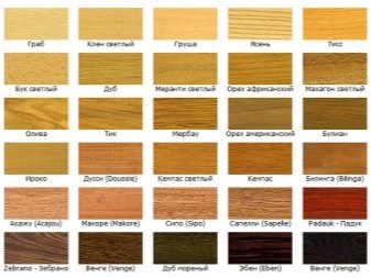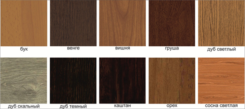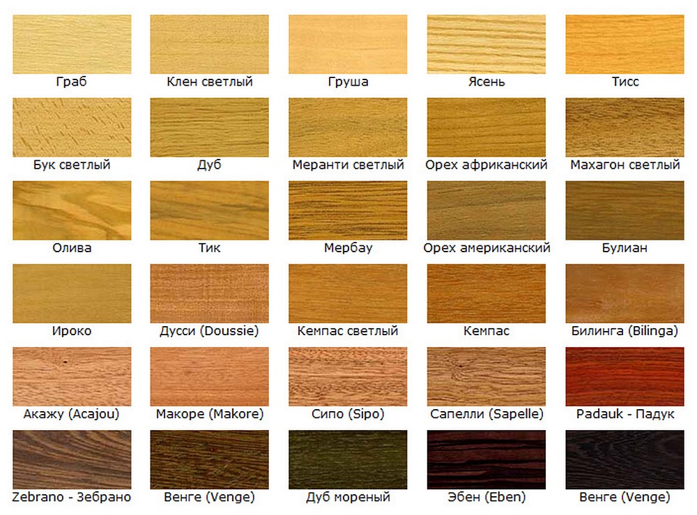 La gamme de nuances comprend les frênes, hêtres, érables clairs, noix, iroko, cerises, acajous et beaucoup d'autres, y compris les races extrêmement rares et exotiques. Les couleurs sont toutes les nuances de gris clair, beige, brun foncé et noir et gris. Certaines espèces donnent un ton rougeâtre et brique, d'autres ont une teinte jaunâtre.