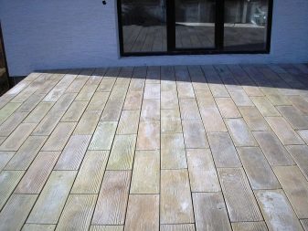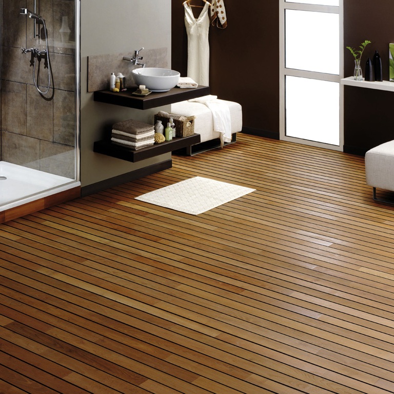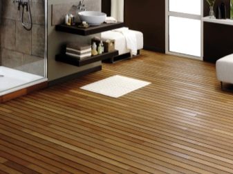 - Les dalles en bois résistent à l'humidité. Il remplacera facilement le stratifié, car il ne change pas sa structure et son degré de fixation à la base, même en cas de séjour prolongé d'eau à la surface.