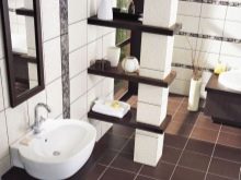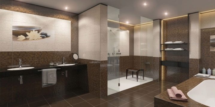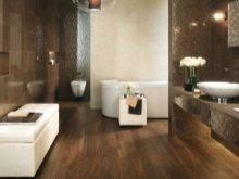 La combinaison de sol marron et de murs beiges sera très noble. Une telle salle de bain est magnifique.