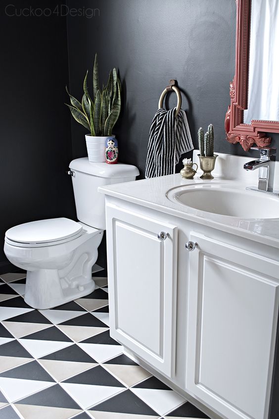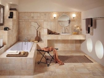 Pour les amateurs de minimalisme, une bonne solution serait de choisir la même couleur pour le sol et les murs. Et il est possible de diluer la monotonie avec divers éléments intérieurs lumineux, tels que des serviettes sur les murs et un tapis sur le sol. Aujourd'hui, les revêtements de sol sont souvent utilisés sous les arbres, sous les cailloux, avec des ornements, des thèmes marins et un design 3D.