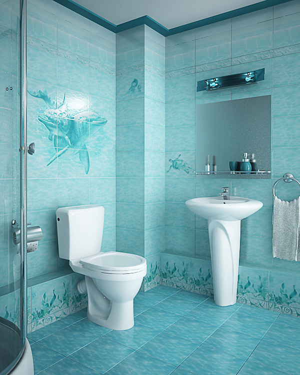 Les carreaux bleus et bleus conviendront au style marin de l'intérieur de la salle de bain.