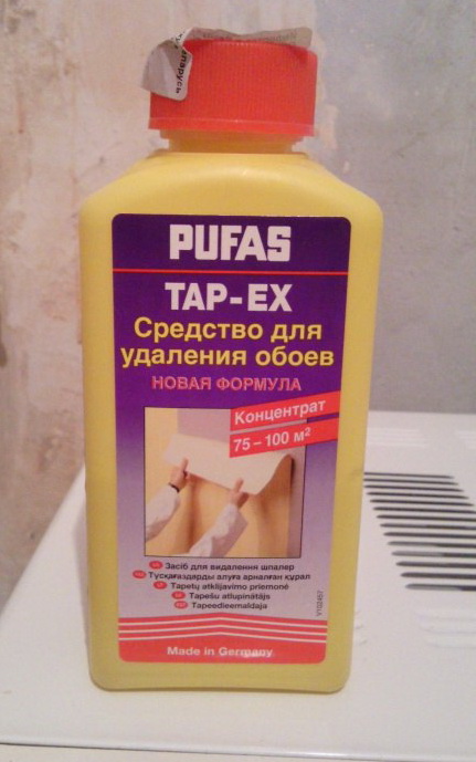 Toutes les méthodes ci-dessus sont idéales pour enlever le papier peint des murs en béton. Ce dernier devrait être discuté plus en détail. Cette méthode est utilisée non seulement dans les cas difficiles, mais également lorsque vous souhaitez gagner le plus de temps possible. La composition spéciale de Pufas Tap-Ex (Pufas Tap Ex) est à juste titre populaire. L'outil peut éliminer complètement divers revêtements.