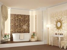 - La combinaison la plus courante est le papier peint et les carreaux. Le plus souvent, les carreaux sont installés dans des endroits où l'eau tombe (près du bord de la salle de bain, près du lavabo), et au-dessus, ils peuvent être posés en papier peint. Même à l'intérieur de la salle de bain, les carreaux sont utilisés pour créer une mosaïque sur un mur séparé ou une zone adjacente à la plomberie. La tuile peut être un insert ou un panneau supplémentaire dans certaines zones de la pièce.