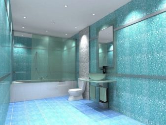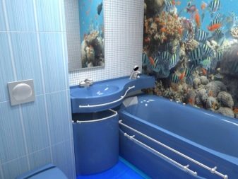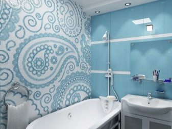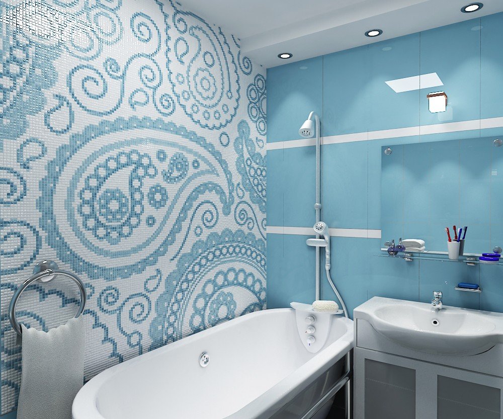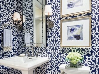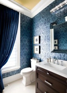 - La couleur bleue du papier peint et des panneaux vous permet de jouir d'une sensation de propreté et de fraîcheur totale. L'ornement floral et le tissage ressemblent harmonieusement à une baignoire, à un lavabo et à tout l'intérieur de la pièce.