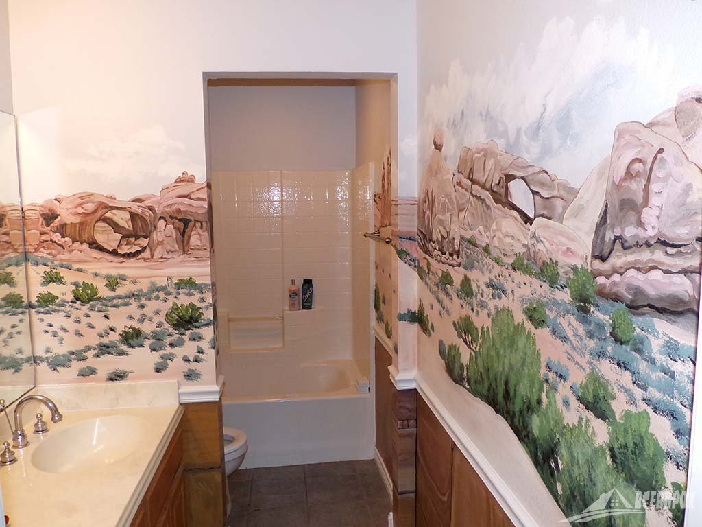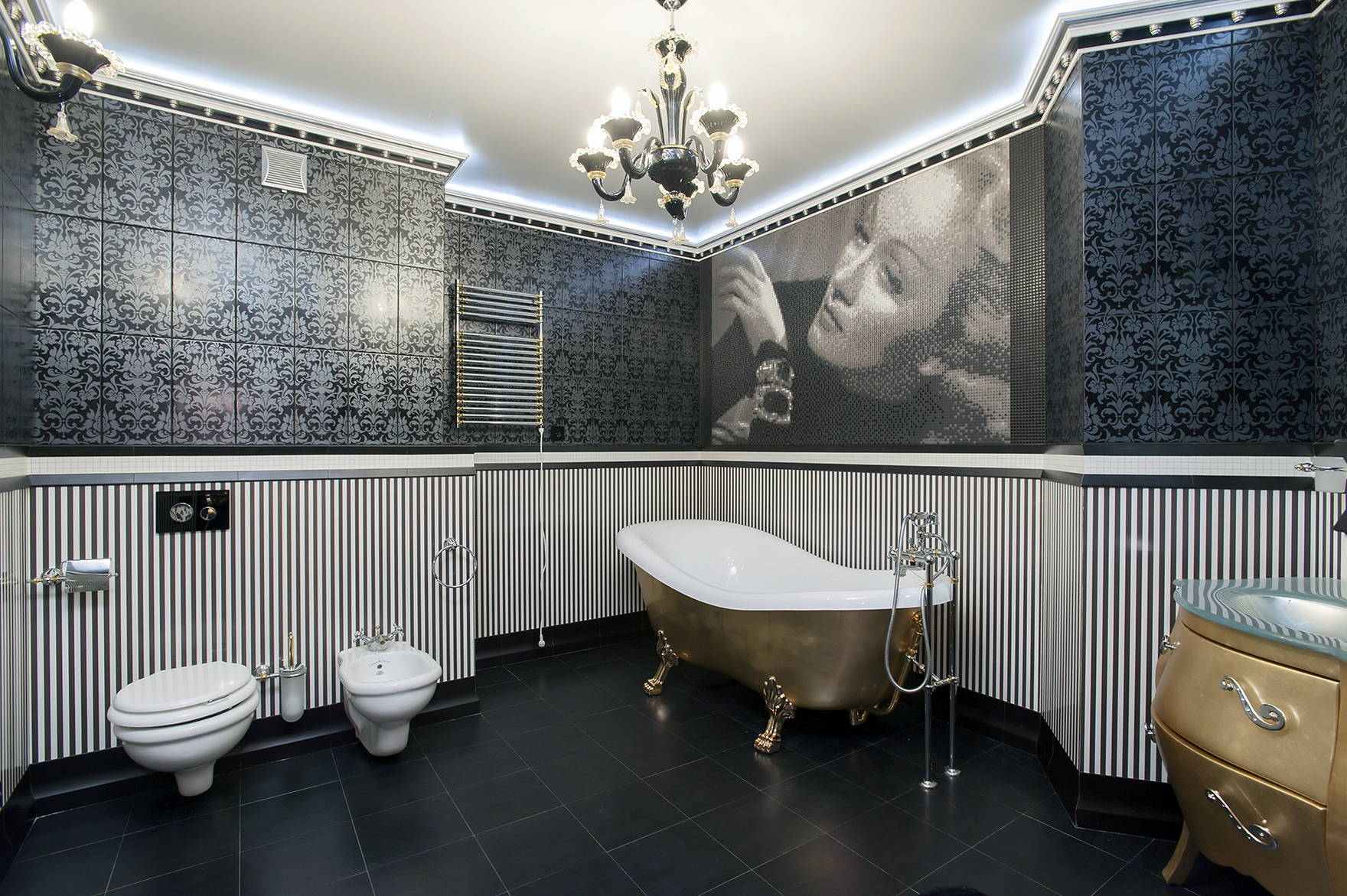 - Le plus sûr et le plus approprié pour coller est la zone au-dessus de 70 cm du bain. Toute combinaison de toiles fonctionnera ici.