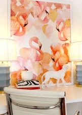 Le style de l'image revêt également une importance considérable. Celles-ci peuvent être des toiles représentant une multitude de petits oiseaux. Ou un papier peint avec de grands flamants roses, presque la taille de tout le mur. Les oiseaux peuvent être stylisés de différentes manières et représentés sur un fond simple et monophonique. Et ils peuvent être aussi semblables que possible aux vrais flamants roses dans leur habitat naturel.