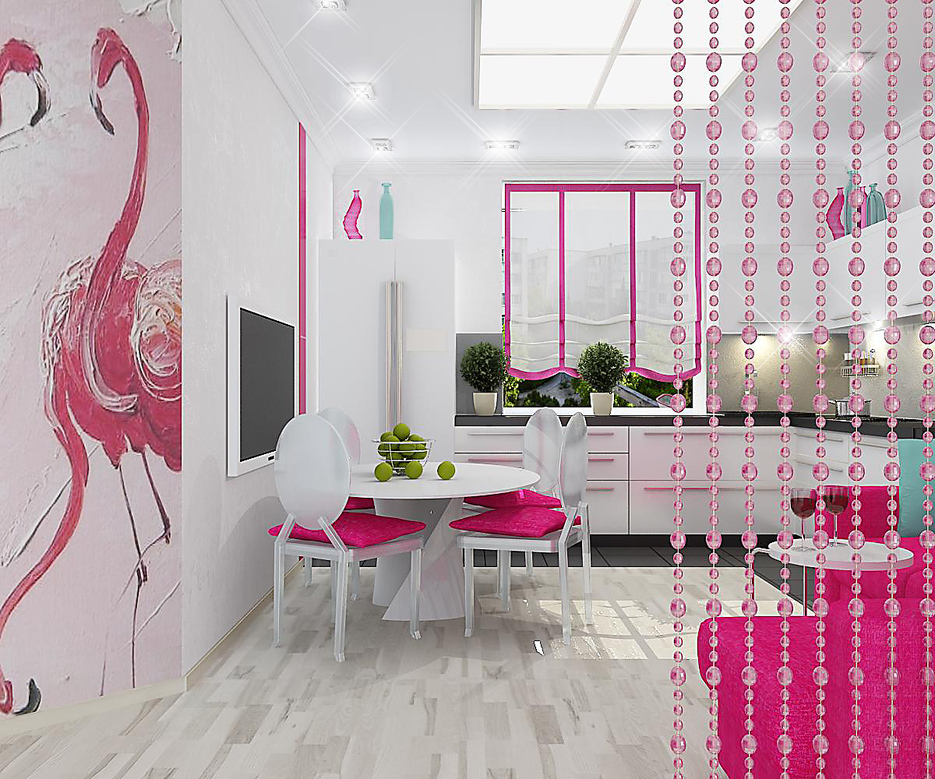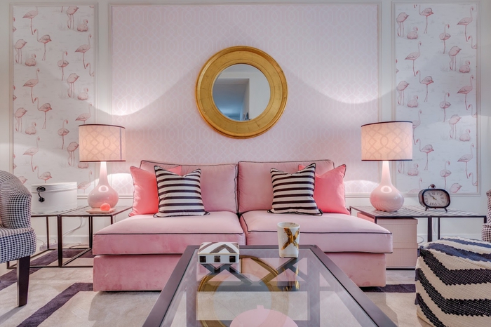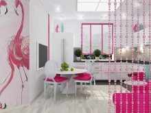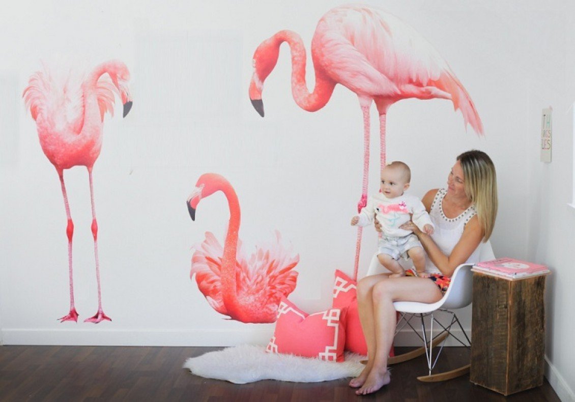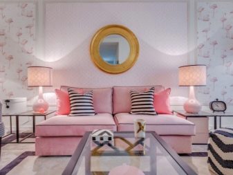 Ainsi, si le flamant rose sur les murs a une riche couleur rose, les accessoires du même ton sont parfaits pour compléter le décor. Cela peut être un vase, une horloge, une table ou un tapis moelleux.