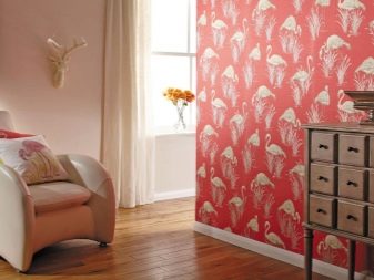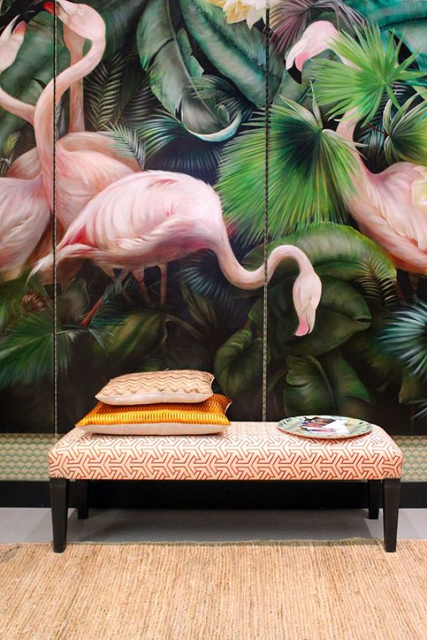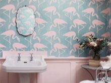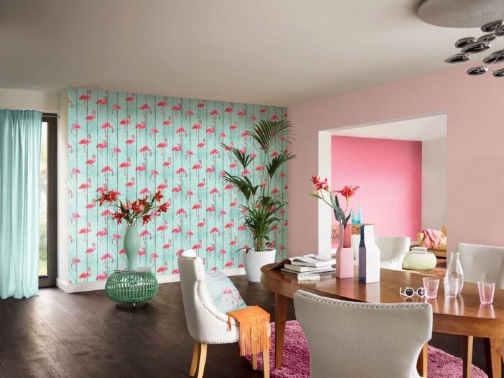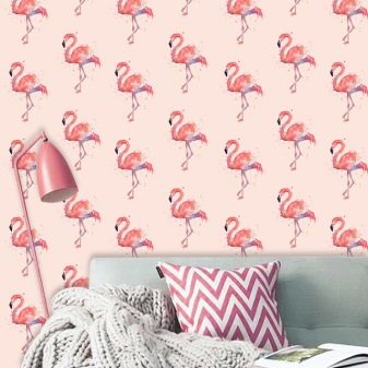 Bien sûr, le papier peint avec des flamants roses tropicaux ne convient pas au style classique ou baroque. Le plus souvent, ces modèles sont utilisés dans les intérieurs de jeunes modernes. En outre, il s’agit d’une excellente option pour la conception orientale de la décoration intérieure. Dans ce cas, le motif peut être répété sur un écran, des textiles, des figurines, un tapis, etc.