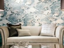 Pour que le papier peint à motif exotique soit aussi harmonieux que possible à l'intérieur, il est important d'ajouter une photo avec les accessoires appropriés. Ce sera très bien s'il y a des détails dans la pièce qui répètent le style du papier peint.Cela peut être n'importe quoi: petits coussins de canapé, rideaux, rembourrage d'un des meubles.
