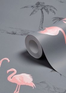 Sur le marché moderne, il existe plusieurs options pour les papiers peints avec flamants roses, qui diffèrent non seulement par leur couleur et leur design, mais également par leur composition. Les tissus peuvent être en papier, en vinyle, en non-tissé. Le papier peint en verre est également très populaire. Cette variante de matériaux de finition est la plus durable, durable et résistante aux dommages mécaniques. Il est idéal pour ceux qui ont de jeunes enfants ou des animaux domestiques dans la maison.