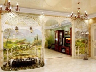 - L'extension des limites d'un petit couloir aidera les peintures murales de papier peint à créer l'illusion d'espace supplémentaire. Allées fleuries, rues européennes, balcons donnant sur le jardin luxuriant - toute composition en harmonie avec le style conviendra ici.