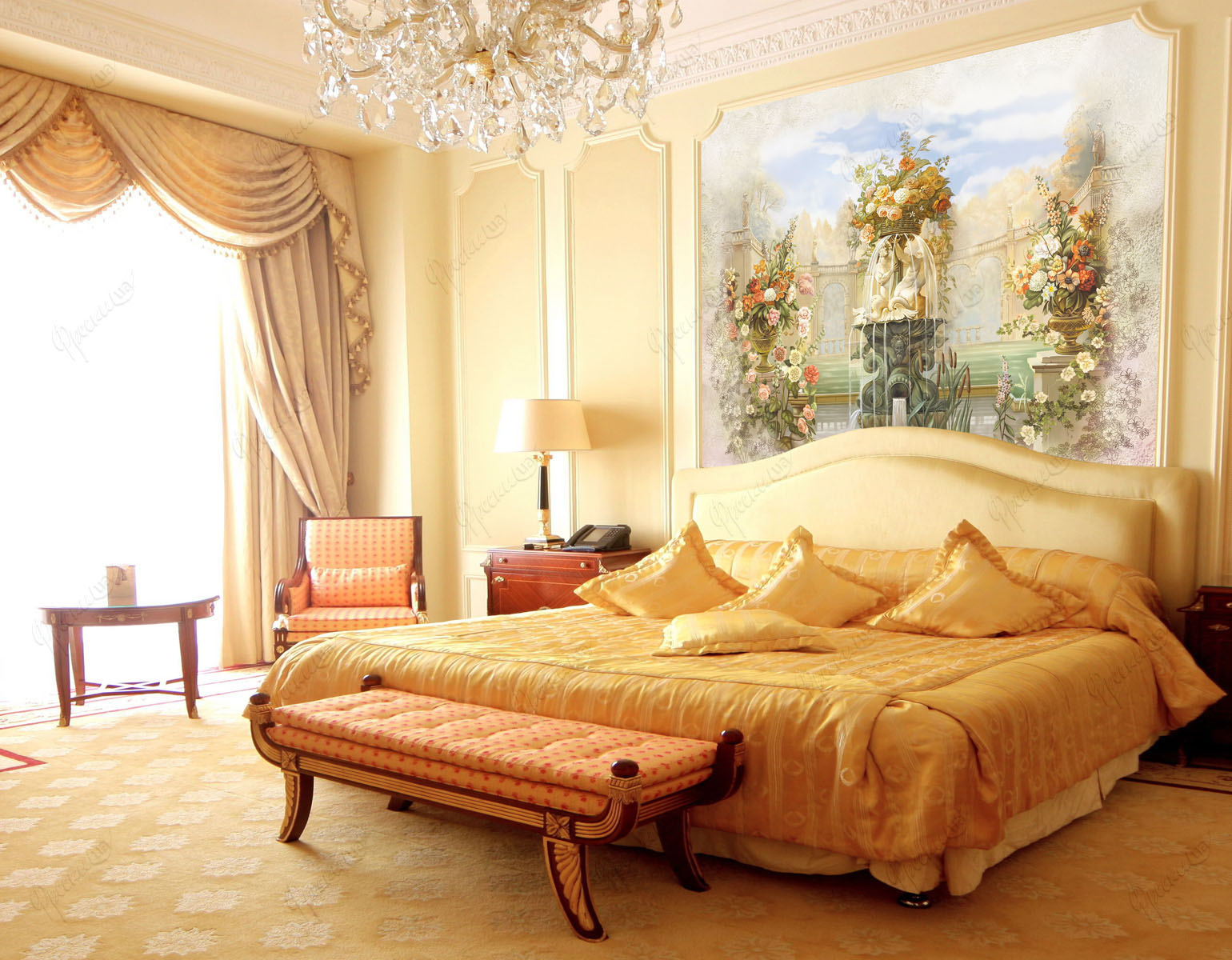 Une autre excellente option pour une chambre à coucher de style classique est une fontaine exquise entourée de fleurs luxuriantes.