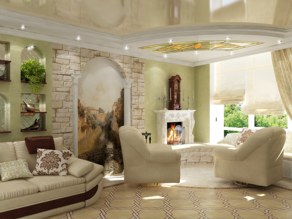 - Les salons spacieux offrent de superbes scènes historiques à grande échelle, de grandes compositions naturelles et urbaines. La palette de couleurs peut être n'importe laquelle. L'essentiel est qu'il soit en harmonie avec le mobilier et les autres meubles.