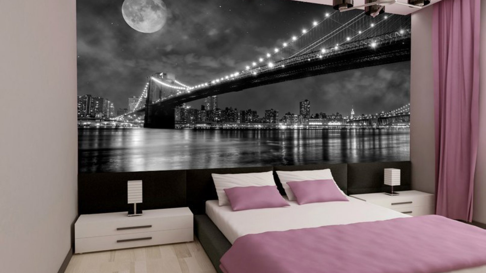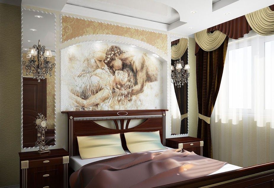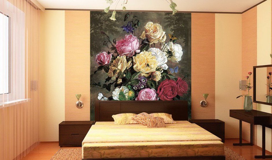 - Dans la chambre à coucher, vous pouvez créer une atmosphère chaleureuse et romantique grâce aux images de fleurs volumétriques, de coquillages avec perles, d’oiseaux de paradis ou de couples amoureux. Lorsque vous choisissez une nuance, privilégiez les tons pastel. Les papiers peints sombres peuvent être appropriés si nécessaire pour contraster avec les meubles blancs. Les couleurs vives dans cette partie de la maison doivent être évitées.