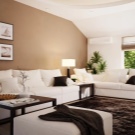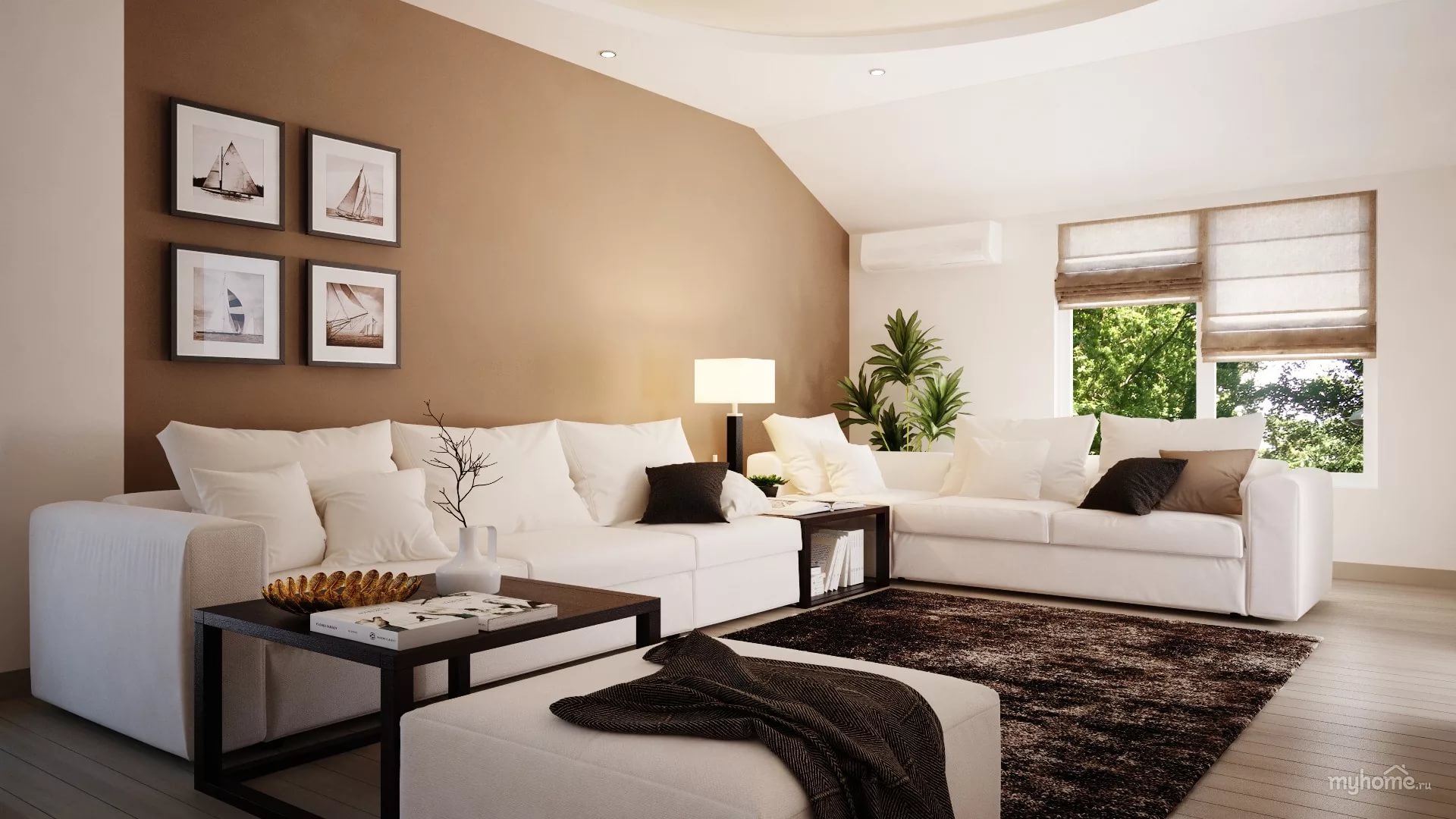 - La nuance principale est le choix des meubles rembourrés.Il semble le plus avantageux en contraste avec la couleur du café des murs. Ce canapé a une sellerie laitière ou blanche. Mais il est recommandé de disposer des coussins décoratifs de manière à ce qu'ils répètent la couleur des murs. Si vous choisissez un canapé pour la couleur du papier peint, vous devez obtenir une harmonie avec le papier peint en choisissant une tapisserie aux accents clairs, en répétant les caractéristiques du motif sur les murs.